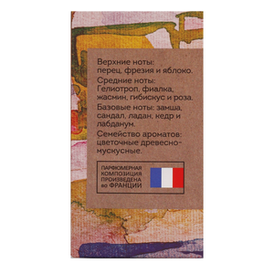 Очаровательный аромат, который раскрывает все грани женственности и вызывает восторг. Сочетание цветочных нот с глубокими оттенками кедра и сандалового дерева создает незабываемый шлейф чувственности и нежности.ВЕРХНИЕ НОТЫ: ПЕРЕЦ, БЕЛАЯ ФРЕЗИЯ. ЯБЛОКО;НОТЫ СЕРДЦА: ФИАЛКА, ГИБИСКУС, ЖАСМИН;НОТЫ БАЗЫ: ЛАБДАНУМ, САНДАЛ, ЛАДАН, БЕЛЫЙ КЕДР.
