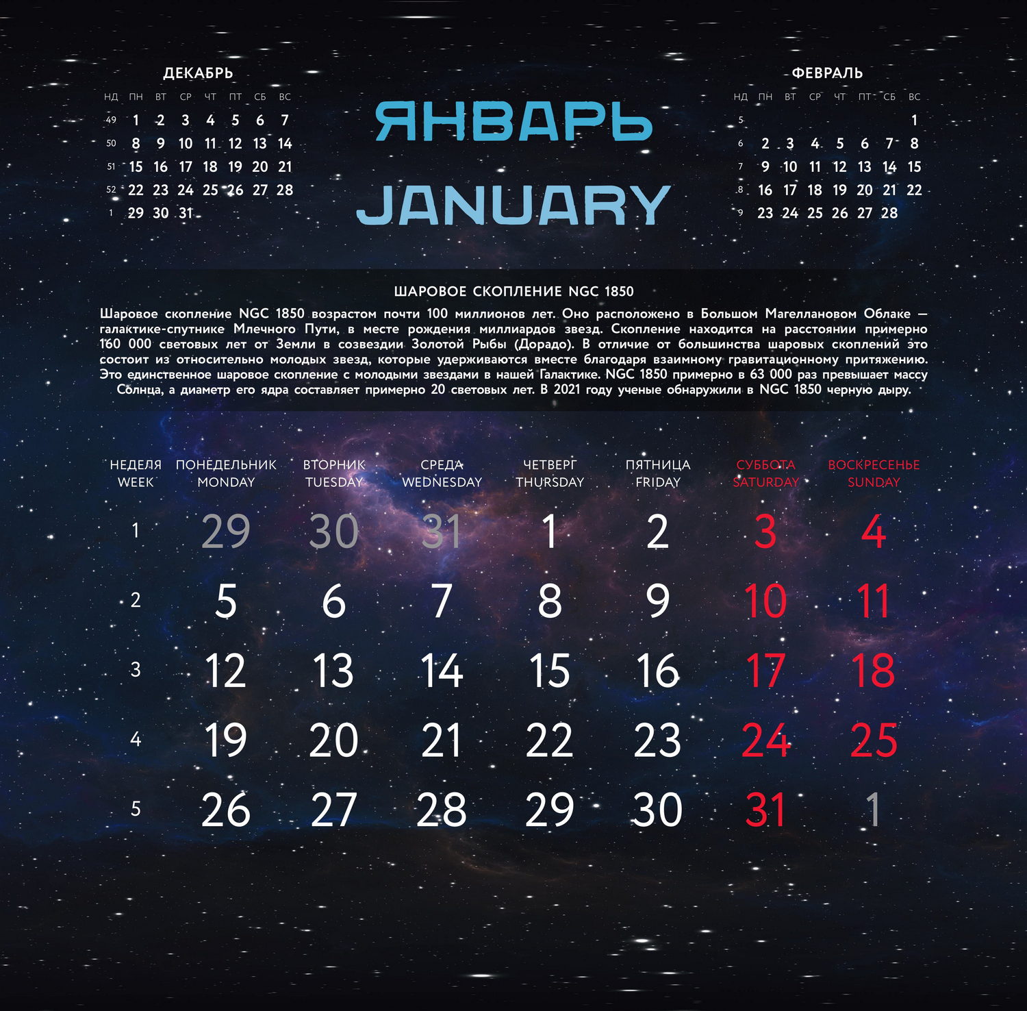 В этом календаре представлены подлинные фотографии космоса, сделанные легендарным космическим телескопом «Хаббл». Его открытия стали настоящим прорывом в астрономии — не только для ученых, но и для широкой публики. В отличие от своих предшественников, «Хаббл» сделал космос ближе, понятнее и увлекательнее для людей всех возрастов. Его яркие и детализированные снимки стали основой для важнейших научных открытий, касающихся структуры и развития Вселенной, агалктик, туманностей, звезд, экзопланет и ближайших объектов в нашей Солничной системе. Благодаря наблюдениям «Хаббла» мы по-новому взглянули на бескрайний космос и на собственное место в нем.