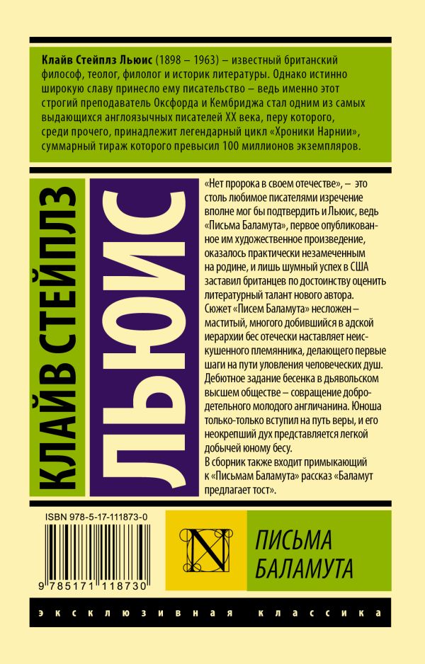 «Нет пророка в своем отечестве», – это столь любимое писателями изречение вполне мог бы подтвердить и Льюис, ведь «Письма Баламута», первое опубликованное им художественное произведение, оказалось практически незамеченным на родине, и лишь шумный успех в США заставил британцев по достоинству оценить литературный талант нового автора.Сюжет «Писем Баламута» несложен – маститый, многого добившийся в адской иерархии бес отечески наставляет неискушенного племянника, делающего первые шаги на пути уловления человеческих душ. Дебютное задание бесенка в дьявольском высшем обществе – совращение добродетельного молодого англичанина. Юноша только-только вступил на путь веры, и его неокрепший дух представляется легкой добычей юному бесу.