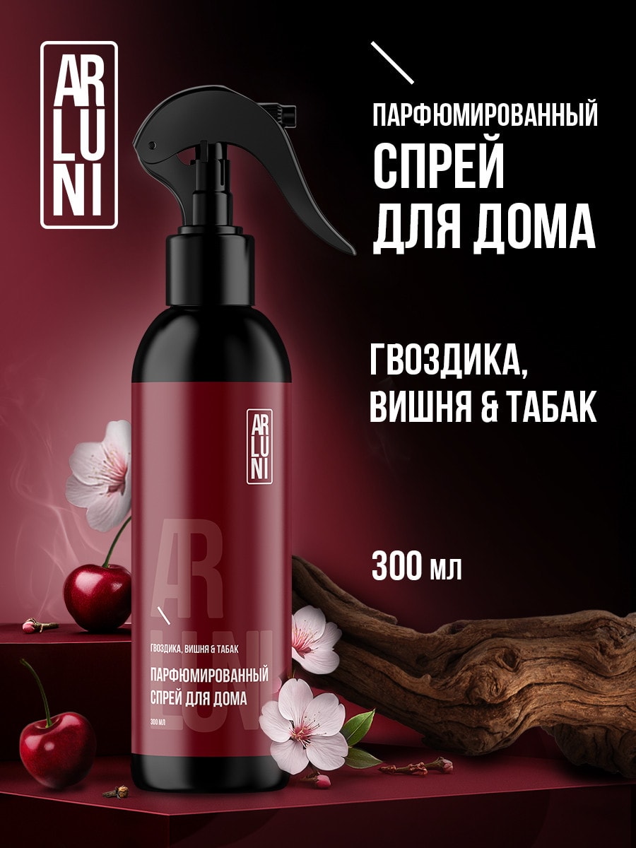 Парфюмированный спрей для дома и туалета Arluni — эффективное средство бытовой химии, которое обеспечивает мгновенное устранение неприятных запахов и надолго сохраняет свежесть воздуха в вашем доме. Завораживающая композиция контрастов: пряная острота гвоздики, сочная сладость вишни и благородная терпкость табака - это те самые, неповторимые ароматы, создающие атмосферу чистоты и гармонии не только в туалете, кухне или ванной комнате. Но и в любых других помещениях вашей квартиры или дома. Многосоставная парфюмерная композиция продукта постепенно раскрывает свои ноты, погружая вас в приятную обстановку спокойствия и расслабления.Универсальный освежитель воздуха наполнит свежестью и чистотой каждую из комнат вашей квартиры. Он легко устранит запахи табака и сигарет, а также нейтрализует специфические ароматы, остающиеся после домашних животных (кошек и собак). Водный парфюмированный спрей для дома подходит для использования в гардеробных и других помещениях, где хочется создать атмосферный аромат. Освежитель для дома не только обеспечивает приятную ароматизацию в комнатах, но и способствует осаждению пыли в момент распыления.