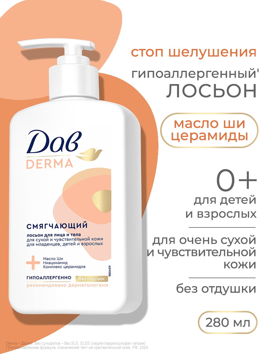 Смягчающий лосьон для лица и тела Дав Derma — это новинка, которая станет незаменимым помощником в ежедневном уходе за сухой и чувствительной кожей. Благодаря своему, тщательно подобранному составу без отдушек, этот продукт подходит для всей семьи: новорожденных малышей, детей мальчиков и девочек, подростков и взрослых мужчин и женщин.Формула лосьона обогащена маслом ши и ниацинамидом (витамин В3), которые эффективно питают кожу, способствуя её восстановлению и смягчению. Церамиды укрепляют защитные функции кожи, снижая раздражение и предотвращая потерю влаги. Лосьон для лица обеспечивает интенсивное увлажнение, восстанавливает естественный барьер кожи и уменьшает ощущение сухости и стянутости. Рекомендовано дерматологами. Клинически доказанный результат.