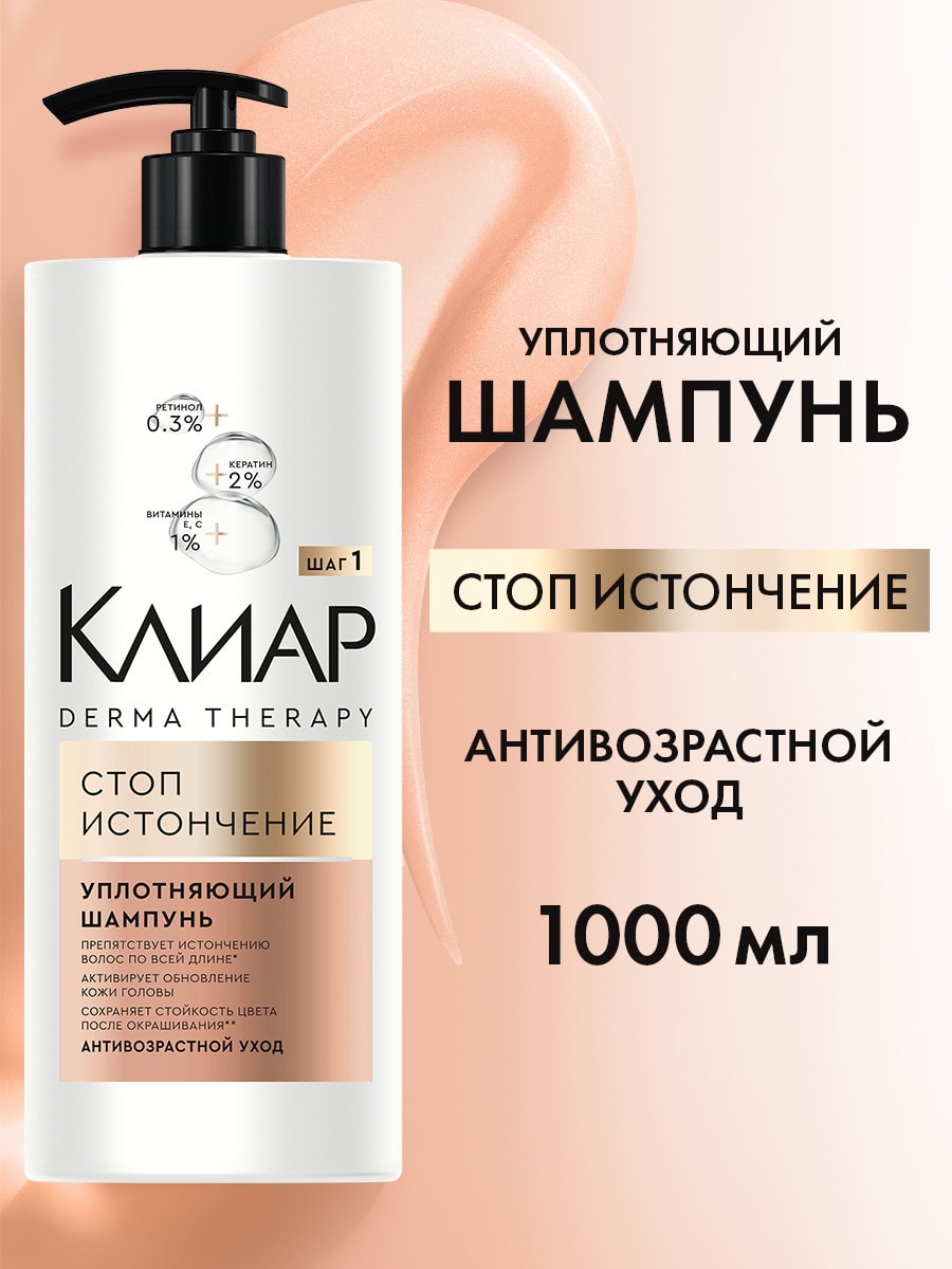 Шампунь с кератином для уплотнения волос Клиар — это идеальное решение для женщин, стремящихся вернуть своим локонам объем и силу.Этот продукт, разработанный в рамках системы ухода Клиар Derma Therapy, помогает предотвратить истончение волос по всей длине*. Формула средства обогащена 0,3%' ретинола и 2% кератина', - ингредиентами, способствующими омоложению и обновлению кожи головы''.