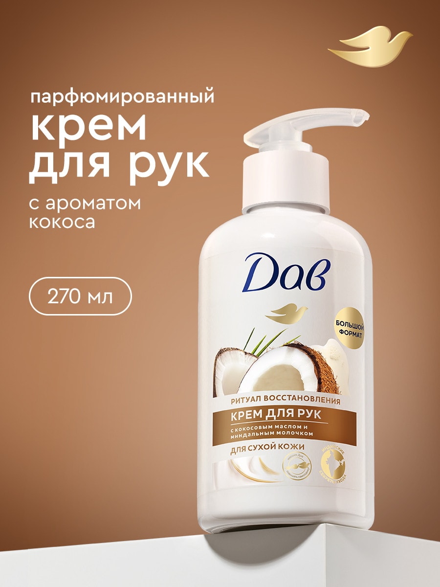 Увлажняющий крем для рук с кокосом и миндалем Дав Ритуал Восстановления — это то самое косметическое средство, которое необходимо для ежедневного ухода за сухой кожей рук. Этот универсальный продукт подходит для использования женщинам, девушкам и подросткам с 14 лет.Парфюмированный питательный крем для рук ухаживает за кутикулой и ногтями, даря им красоту и ухоженный вид. Его формула содержит в своем составе кокосовое масло, благодаря которому кожа получает восхитительное увлажнение и мягкость. Кроме того, оно прекрасно питает даже самую сухую и обезвоженную кожу, сохраняя ее упругость и эластичность. Миндальное молочко в составе крема для сухой кожи рук возвращает тонус коже, увлажняет ее и оставляет ощущение нежности и комфорта.
