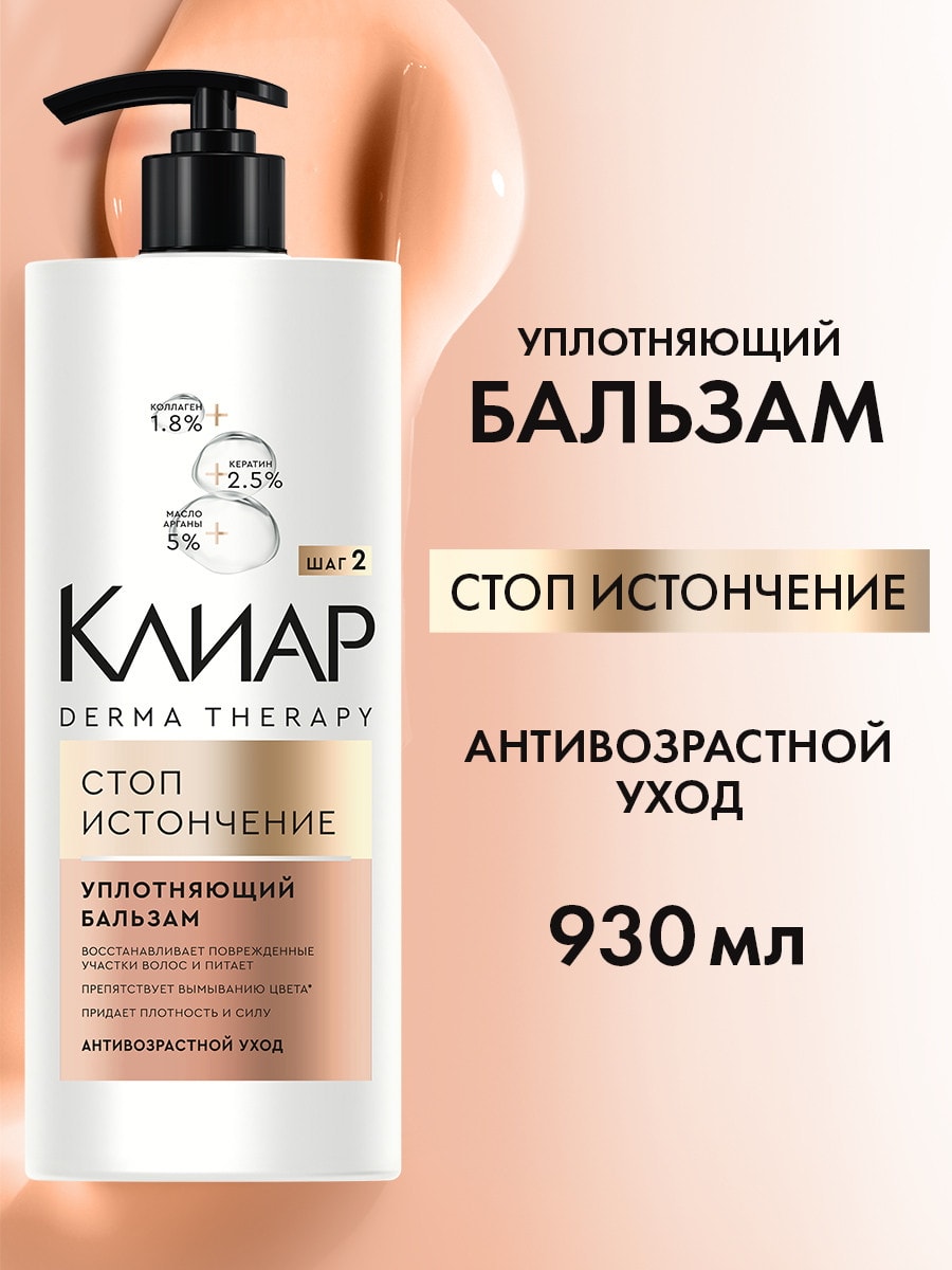 Бальзам ополаскиватель для волос с кератином Клиар — это восстанавливающее средство, разработанное специально для ухода за поврежденными локонами.Формула продукта включает в себя 1,8%' коллагена, 2,5%' кератина и 5%' масла арганы, - ингредиенты, которые обеспечивают глубокое питание волос и восстановление их структуры''. Средство подходит для всех типов волос. Бальзам Клиар DERMA THERAPY – это идеальный выбор для тех, кто столкнулся с проблемой истончения волос и потерей их объема.