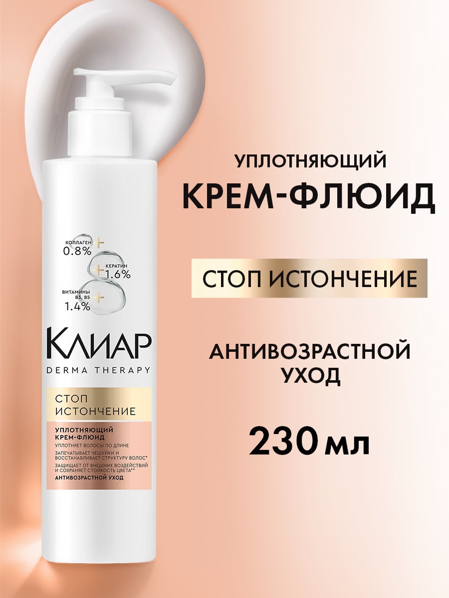 Крем-флюид для волос Клиар — это несмываемое средство для локонов, которое обеспечивает им оптимальный уход.Формула крема включает в себя 0,8%' коллагена, 1,6%' кератина и 1,4%' витаминов В3 и В5, - ингредиенты, которые обеспечивают комплексное восстановление и уплотнение волос по всей длине''.