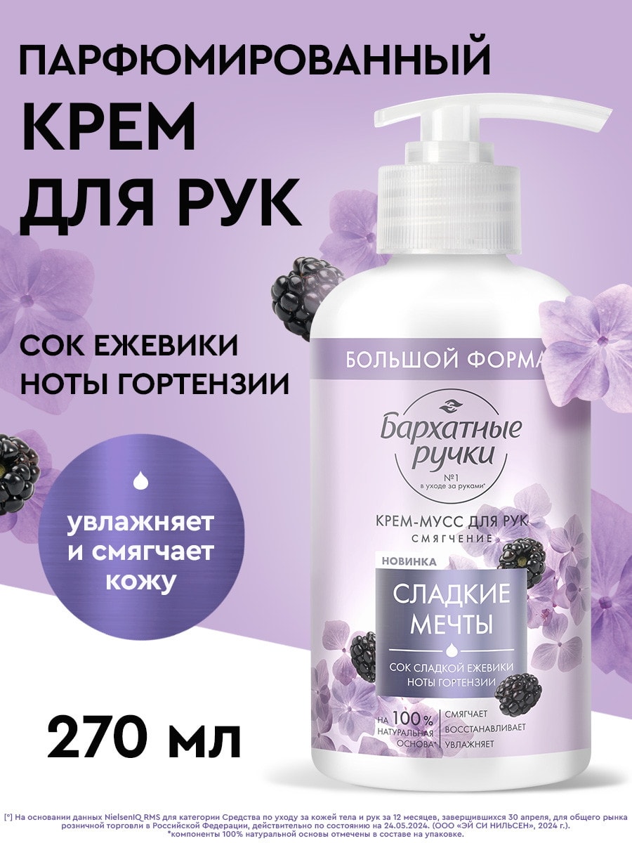 Крем-мусс для рук Смягчение Сладкие мечты из новой парфюмированной серии от эксперта №1 в уходе за руками °– Бархатные ручки – с манящим ароматом спелых ягод и нотками роскошной гортензии не только сделает ваши ручки вновь ухоженными, но и будет невероятно приятен при нанесении.• Формула на 100% натуральной основе, обогащенной маслами миндаля и ши, а также соком ежевики, решает сразу три задачи: эффективно смягчает, восстанавливает и питает.