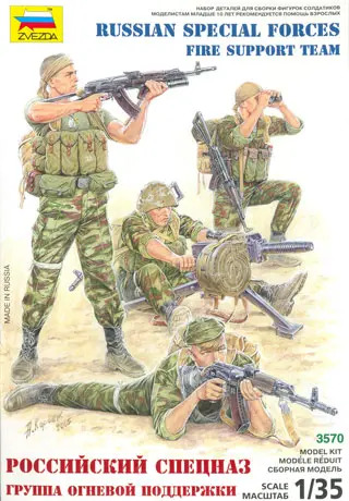 Модель сборная "Российский спецназ №2".Группа вооружена автоматами Калашникова различных модификаций, автоматическим станковым гранатометом АГС-17.Упаковка: картонная коробка.